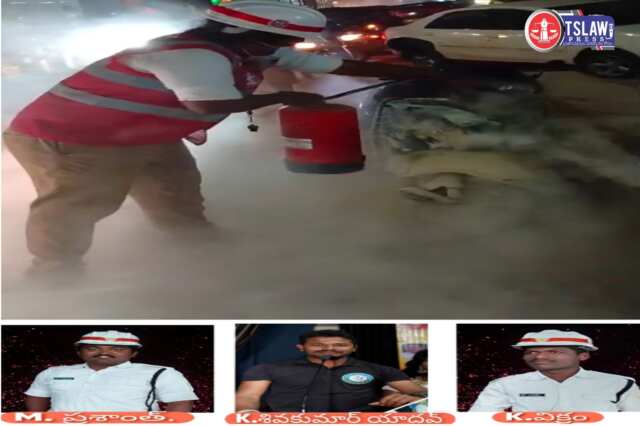 ఈ ఘటనను గమనించిన జీడిమెట్ల ట్రాఫిక్ పోలీస్ స్టేషన్ పరిధిలో విధులు నిర్వహిస్తున్న ట్రాఫిక్ మార్షల్స్ మద్దూరి ప్రశాంత్, కట్టేబోయిన శివకుమార్ యాదవ్, కొమ్ము విక్రం వెంటనే అప్రమత్తమయ్యారు. సమయాన్ని వృథా చేయకుండా పక్కనే ఉన్న భారత్ పెట్రోల్ బంక్ నుంచి భద్రతా చర్యల కోసం ఉపయోగించే నైట్రోజన్ సిలిండర్ తీసుకువచ్చి మంటలను అదుపులోకి తీసుకువచ్చారు.