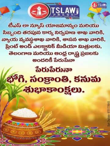 తెలంగాణ, ఆంధ్రప్రదేశ్ : టీఎస్ లా న్యూస్ యాజమాన్యం మరియు సిబ్బంది తరపున కార్య నిర్వహణ శాఖ వారికి, న్యాయ వ్యవస్థశాఖ వారికి, శాసన శాఖ వారికి, ప్రింట్ అండ్ ఎలక్ట్రానిక్ మీడియా మిత్రులకు, తెలంగాణ మరియు ఆంధ్ర రాష్ట్ర ప్రజలకు అందరికీ పేరుపేరునా భోగి, సంక్రాంతి, కనుమ శుభాకాంక్షలు.