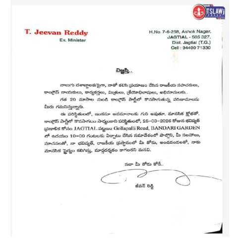 జగిత్యాల జిల్లా కేంద్రం లో మాజీ మంత్రి జీవన్ రెడ్డి పత్రిక సమావేశంలో నాలుగు దశాబ్దాలకుపైగా నాతో కలిసి ప్రయాణం చేసిన రాజకీయ సహచరులు, కాంగ్రెస్ నాయకులు, కార్యకర్తలు, మిత్రులు, శ్రేయోభిలాషులు, అభిమానులకు.. గత 20 నెలల నుంచి కాంగ్రెస్ పార్టీలో కొనసాగుతున్న పరిణామాలను మీరు గమనిస్తున్నారు. ఈ పరిస్థితులలో ఇంకనూ అవమానాలకు గురి అవుతూ, మానసిక క్షోభతో, కాంగ్రెస్ పార్టీలో కొనసాగటం సాధ్యంకాని పరిస్థితులలో 2026, మార్చి 25 రోజున భవిష్యత్ ప్రణాళిక కోసం జగిత్యాల పట్టణంలోని గొల్లపల్లి రోడ్డు బండారి గార్డెన్‎లో ఉదయం 10:00 గంటలకు ఏర్పాటు చేసిన సమావేశంలో పాల్గొని, మీ సలహాలు, సూచనలతో, భవిష్యత్, రాజకీయ ప్రస్థానంలో మీ తోడు, అందదండలతో, వాకు మానసిక స్థైర్యం కలిగిస్తు, మార్గదర్శకం కాగలరని మనవి” అని లేఖలో పేర్కొన్నారు.