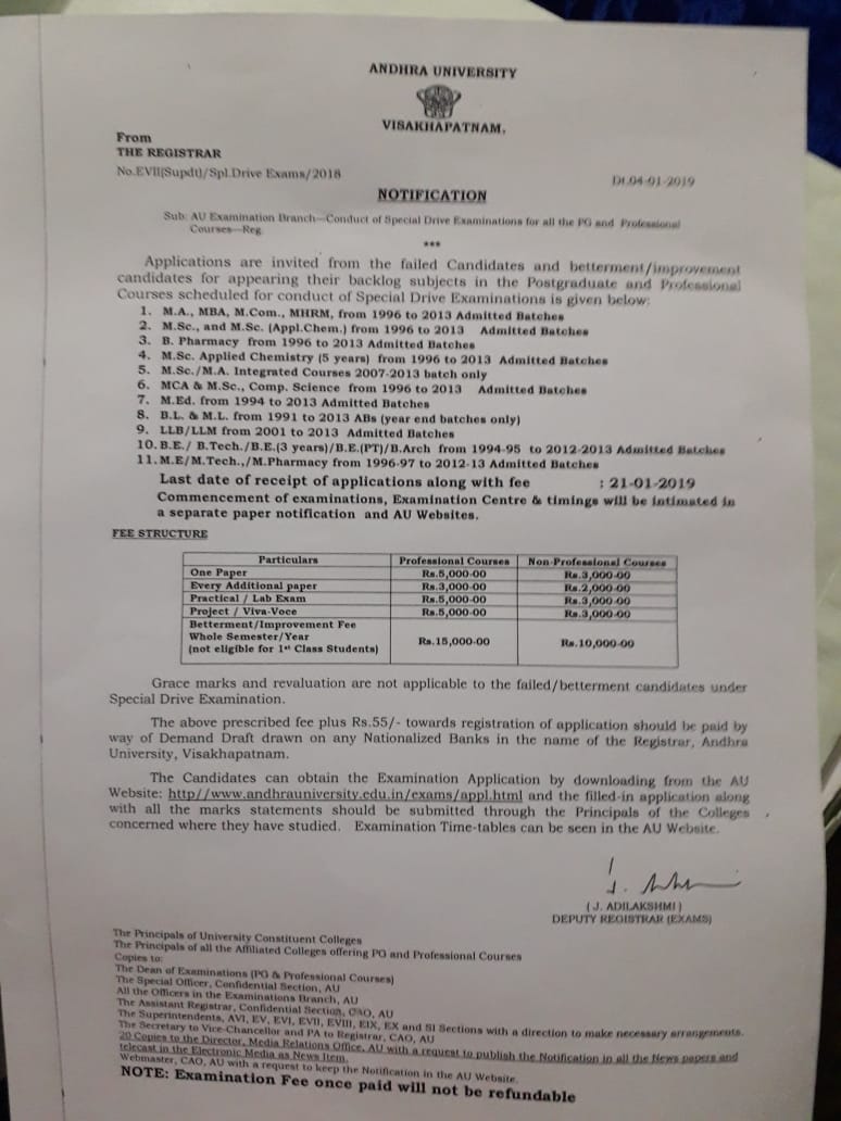 ఆంద్రప్రదేశ్ లోని ఆంధ్రా యూనివర్సిటీలో గతంలో చాలా పకడ్బందీగా క్రమ పద్దతిలో అన్ని విభాగాలు అధికారులు నడిచేవారని పూర్వ విద్యార్థులు తెలియ జేస్తున్నారు. అప్పుడు పనితీరు చాలా ఉన్నతంగా ఉన్నట్లు తెలిసింది. ఐతే గత కొన్ని నెలలుగా అదే ఆంధ్రా యూనివర్సిటీలో కుంభకోణం ఆరోపణలు వస్తున్నాయి. ఆంధ్రా యూనివర్సిటీలో అధికారికముగా పరీక్షలు నిర్వహించుటకు వరుసగా విడుదల చేసిన పరీక్షలు నోటిఫికేషన్లు పరీక్షించగా!