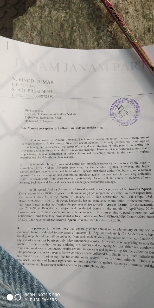 ఈ విధంగా డబ్బులు కట్టించుకుని పరీక్షలు నిర్వహించకుండా, ఒక వేళ్ళ నిర్వహించిన ఫలితాలు వెల్లడించకుండా, మళ్ళీ క్రొత్తగా స్పెషల్ ఎక్సమ్స్ పేరుతో డబ్బులు గుంజుతు న్నారు. ఈ విదంగా విద్యార్థులు భవిష్యత్తు తో  ఆటలు ఆడుకుంటున్నారు అని ఆంధ్రా యూనివర్సిటీ పై కొందరు గవర్నర్ నరసింహన్ గారికి వినతిపత్రం అందజేశారు. ఈ కుంభకోణం మొత్తానికి  బయటికి లాగడం కోఱకు CBI మరియు సిట్టింగ్ జడ్జి తో అత్యవసర సర్వే చేయించాలి అని పలువురు విద్యార్థులు వాపోతున్నారు.