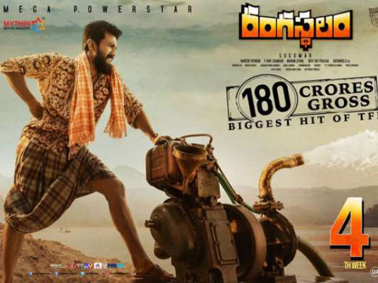 రాంచరణ్ ,సమంత ప్రధాన పాత్రలలో తెరకెక్కిన చిత్రం ‘రంగస్థలం’. సుకుమార్ దర్శకత్వంలో పల్లెటూరి నేపథ్యంగా తెరకెక్కిన ఈ చిత్రం మార్చి 30న విడుదలై భారీ విజయాన్ని సాధించింది. తెలుగు రాష్ట్రాలలోనే కాక ఓవర్సీస్లో కూడా భారీ వసూళ్ళు రాబట్టింది. ఈ చిత్రం 4వ వారానికి గాను 180 కోట్ల కలెక్షన్స్ సాధించింది. రానున్న రోజుల్లో ఈ చిత్రం మరిన్ని రికార్డ్స్ బ్రేక్ చేస్తుందని సినీ విశ్లేషకులు చెబుతున్నారు. ఈ చిత్రంలో అనసూయ, ప్రకాశ్ రాజ్, ఆది పినిశెట్టి, జగపతి బాబు కీలక పాత్రలు పోషించారు.